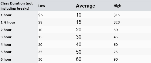 We recommend setting your price between $5 and $10 per hour, per attendee. For example, for a two-hour event a $10 to $20 price would be appropriate and an industry standard in this area. An all day, six-hour workshop would be better priced at $30 to $60 per attendee. Remember that you must have quality substance and content for the time frame of your event. Below is a chart: